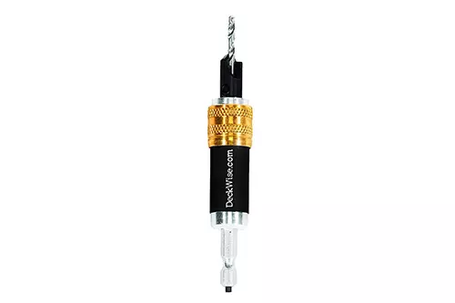 The DeckWise Drill & Drive toolkit includes: Quick Change Locking Collar + 1/8″ (3,2mm) high speed drill bit & 3/8″ (9,5mm) Countersink Tool w/ T15 Star Drive Tip + 1/8″ drill bits & 3/8″ countersinks (3) + T15 Star Drive Tips (4) + On-Board Hex Key.