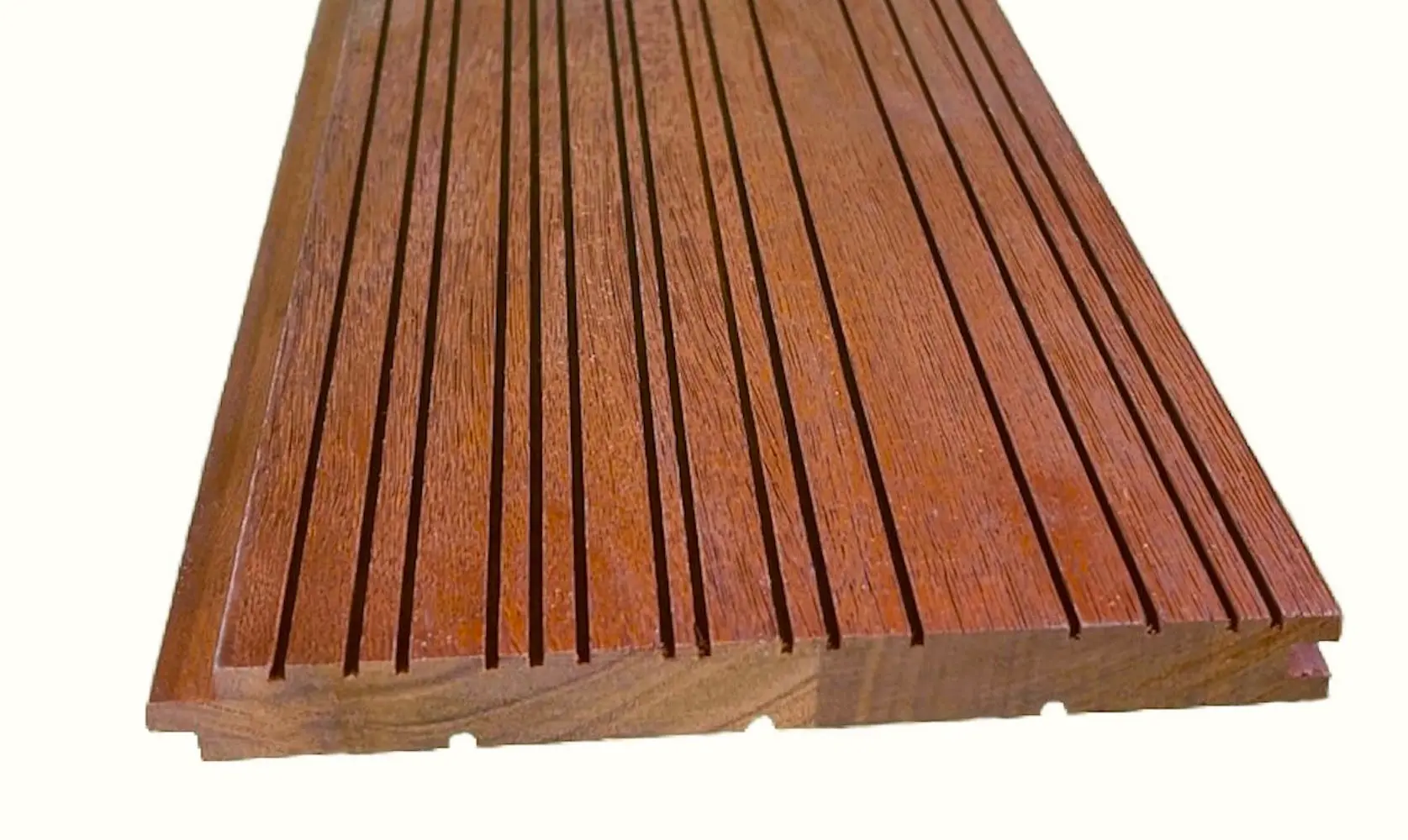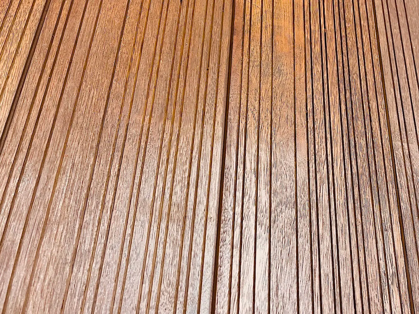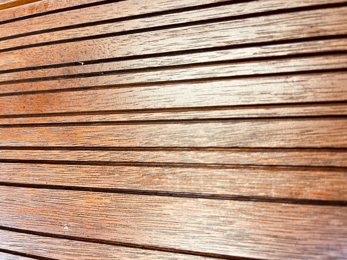 The boards are covered with a double UV protection oil (Hard Wax Oil + Thompson’s Clear Oil) on all four sides. The oil penetrates in the grooves to make them darker than other wood and accent this unique pattern.